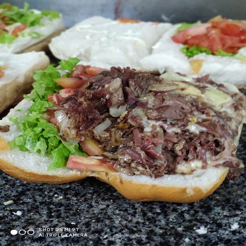 PAO BAGUETE,DOIS SABORES(ALCATRA,PERNIL,FILE DE FRANGO,CHARQUE,LINGÜIÇA),TOMATE,ALFACE E 100G DE MUSSARELA