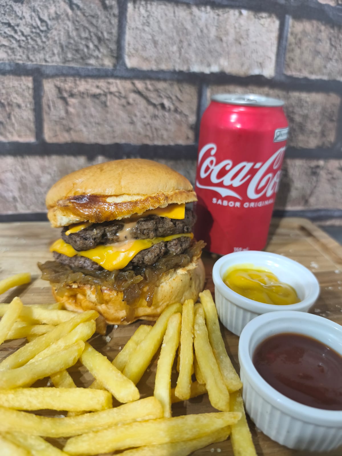 SMACHBURGUER DUPLO COM CEBOLA CARAMELIZADA+BATATA P